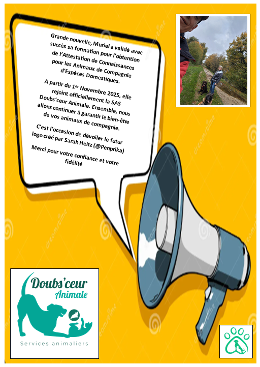 Afin de garantir le bien-être et la sécurité pour vos animaux de compagnie, toutes les formations nécessaires à Doubs’ceur animale ont été dispensées par des professionnels du secteur animalier et dans des établissements agréés par Le Ministère de l’Agriculture et de la Souveraineté Alimentaire, la DRAFF, les Préfectures et les DDETSPP de chaque départements concernés. Concernant les démarches administratives, Doubs’ceur animale est à jour pour ses déclarations en Préfecture, à la Chambre du Commerce et pour ses cotisations à titre professionnel (Assurance Responsabilité Civile, Assurance Automobile, Déclaration TAV et Adhésion Médiation de La Consommation).